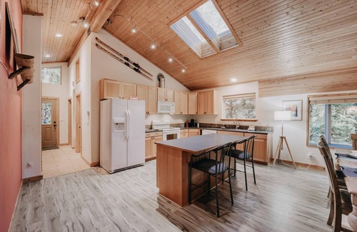 As you step through the front door, you’ll immediately appreciate the welcoming layout of the cabin. To the right, you'll find a convenient laundry cubby with a large capacity stack washer and dryer—perfect for keeping your clothes fresh after a day of hiking, skiing, or exploring the great outdoors. The first bedroom, located just to the left, features a king-sized bed, ensuring a restful night’s sleep. With plenty of closet storage, you'll have no trouble stowing your gear and personal items.