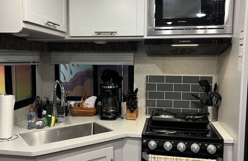 Kitchen: Two burners indoor | George Foreman grill | Refrigerator | Microwave | Dishwasher | Toaster | Drip style coffee pot | Cooking basics | Dishware & flatware | Pots & pans