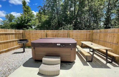 Side: Private, fully fenced hot tub | Concrete patio | Picnic table | Fire pit & chairs | Charcoal grill