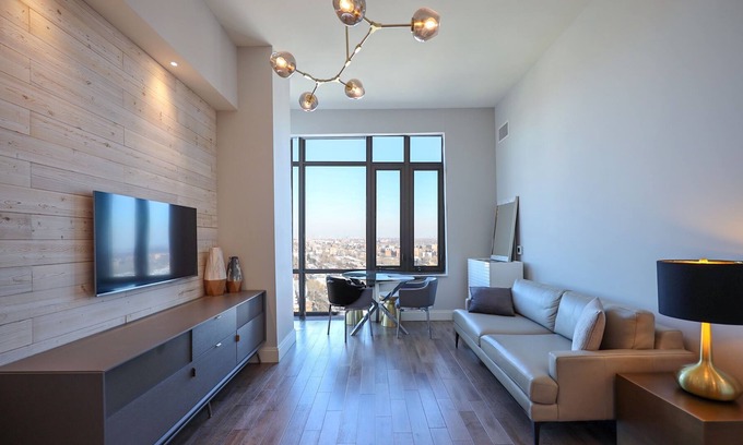 Set inside a modern high rise in Brooklyn, this space radiates openness. You are greeted by an impressive view of the city and with modern top-of-the-line appliances, you have everything you need at your fingertips. Luxury touches, such as a wine fridge, towel warmer, and high-speed internet make this apartment special for all renters.