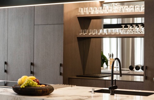 Burnished marble is combined with concrete surfaces and various textures. The interior is full of different shades of grey wood and soft pastel colours. The beauty of high ceilings is boosted by pieces of art.