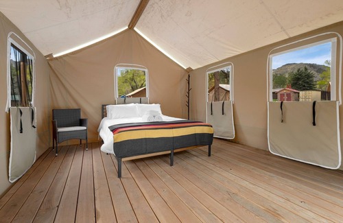 Enjoy our comfortable furnished 12'x14' camping tents located right on the bank of the Poudre River. This tent boasts a welcoming interior featuring a plush queen-size bed for a restful night's sleep. A cozy seating area provides an intimate space to relax, unwind, and savor the scenic surroundings. Designed with your convenience in mind, our tents include ample storage space for luggage, ensuring a clutter-free and comfortable atmosphere. For your utmost comfort, the nearby bathrooms and showers in our brand new comfort station are equipped with heating, and accessible bathrooms and showers are also available.
