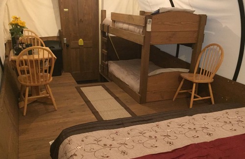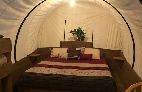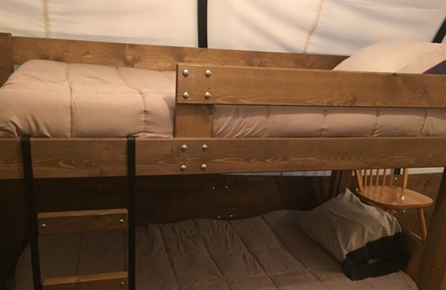 The Unicoi Trail Wagon has a king size bed with a 8" memory foam mattress as well as a set of bunk beds with memory foam mattresses as well. There is a table, microwave, and a coffee pot. The Wagon has electricity with plug ins, USB ports, Heat & Air!