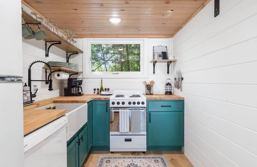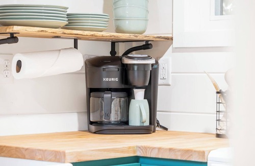 The chic and appealing exterior welcomes you to your new home with comfortable rocking chairs on the porch just begging you to have a seat while you enjoy your morning coffee. Stepping indoors, you’ll be delighted by the spacious yet cozy interior. A comfortable living room sofa is the perfect spot for an afternoon nap or catching up on your reading. Play a game of cards or enjoy your meals at the dining table for 2. The kitchen comes fully equipped with all standard appliances and a dual single-cup and drip coffee maker. You won’t find a TV in this cabin, however, don’t let that deter you. After all, you might just welcome a break from all the noise! Onsite Wi-Fi is still available should you need to stay connected and in touch.