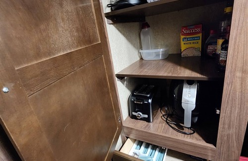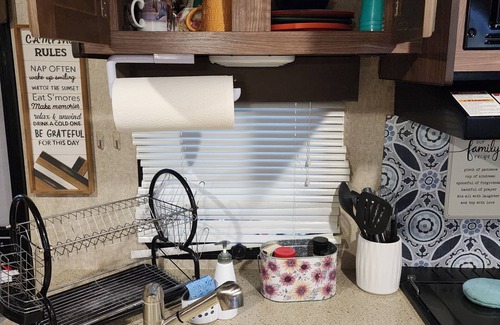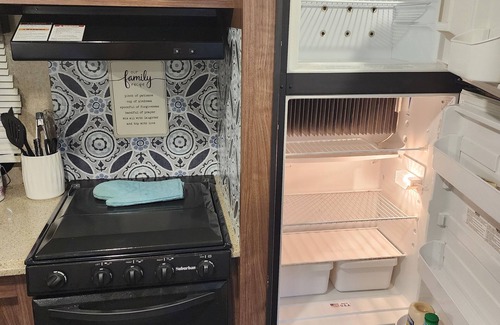 Stay in our 35-foot travel trailer tucked away in a beautiful, paved, gated backyard surrounded by mature trees and landscaping. With two slide-outs, this space feels open and inviting — perfect for families or small groups.