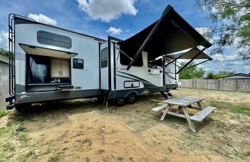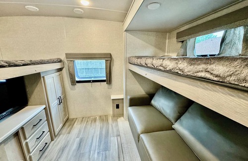 The 37-foot camper is nestled in a private, serene area surrounded by mature trees, providing a tranquil retreat from the hustle and bustle. The natural landscape features native plants that blend seamlessly with the environment. An outdoor picnic area nearby is equipped with a rustic wooden table and comfortable benches, perfect for outdoor dining and relaxation. String lights hang above, adding a touch of magic to evening gatherings and creating a cozy, inviting atmosphere.