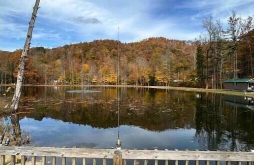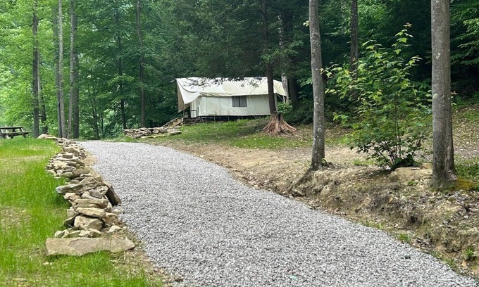 Camping with a touch of creature comfort = Glamping. This is a canvas safari tent with a blow up couch sleeper and comfortable bed for two. Situated overlooking our 3-acre stocked fishing' pond with easy access to our bathhouse, hiking trail entrance, and camp store. Linens are provided. It is not 100% bug or critter proof, so please don't leave food or trash out. Amenities include solar powered lights, and charging station. Come stay on the hill and watch the fish jump.