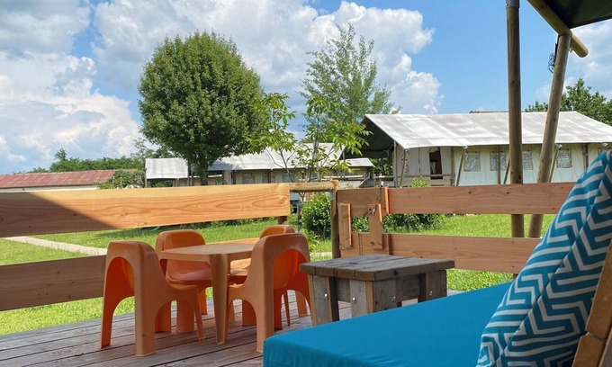 The Safari tents, with their spacious wooden terraces, allow you to enjoy luxury while immersed in nature. The site features a swimming pool, a large open barn, and plenty of shaded picnic areas for relaxing.