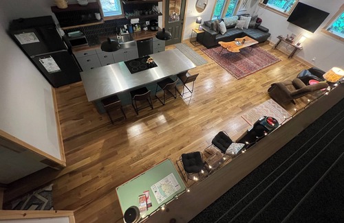 The spacious loft area has a sofa, full bed, 1/2 bath and 3rd bedroom with a queen bed.