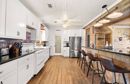 Welcome to Glen Oaks Lakeside Lodge, a rustic yet modern retreat perfect for large families. This charming lake home comfortably sleeps 12 to 14 guests, offering ample space and comfort.
