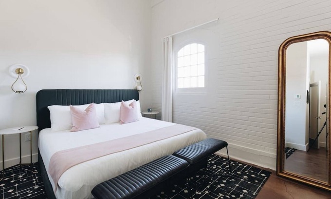 You’ll notice it the instant you walk in – the attention to detail and efforts made to meet the modern travelers' needs. Taking note from the era in which the building was constructed, each room is inspired by rich & playful colors, Art Deco motifs, art and opulent fixtures. Starting with the kitchenette; complete with quartz countertops and brass finishes to the memory foam mattress and spacious bathroom gives each studio an inviting stay. Relax in the velvet armchairs while you sip your morning coffee or evening libation. Each Deluxe Studio offers a coffee station, microwave, mini-fridge, organic toiletries and bath towels, memory foam mattress, closet space, SmartTV, high speed WIFI, eco friendly sateen linens and full length mirror.