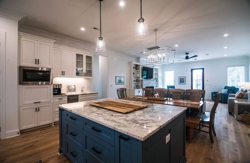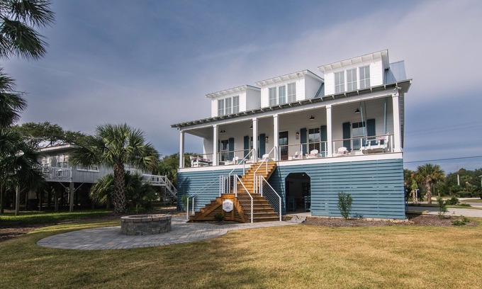 From three primary suites, dual living areas, and inviting décor to the spacious covered deck furnished with custom porch swings and adirondack chairs, your expectations will be exceeded! Unwind into vacation mode in the beautifully appointed living room and stream favorite TV shows. Perch at the bar in the magnificent open kitchen featuring granite countertops and top-of-the-line appliances while the chef prepares a Lowcountry feast, then gather together at the adjacent table for memorable meals. Enjoy coveted outdoor living with picnic tables and tons of seating on the ground-level patio. Other outdoor amenities include a fire pit, long oyster tables, an outdoor sink/fish cleaning station, and a gas grill for cookouts.
