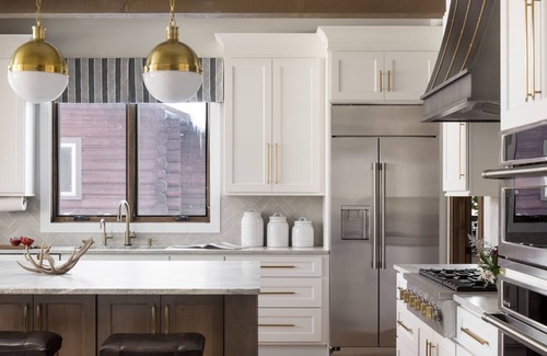 Perfect for Skiing, hiking, curling up with a book in front of the stone fireplace or just lounging around in the fresh mountain air, Glory View welcomes guests into its ample mudroom equipped with four gear lockers to stow all your gear out of sight. Beyond the utilitarian entry lays the expansive gourmet kitchen, designed for both cooking and gathering. Monogram appliances, a six-burner gas stove, a butler’s pantry, wet bar, beverage fridge and an oversized island complete with three counter stools make this gourmet kitchen a wonderful place to gather and recount the days adventures. Additional culinary amenities also include a Nespresso coffee machine and serve wares for all your dinner party needs. Just beyond the kitchen find a dining table for eight (two extra chairs are provided).