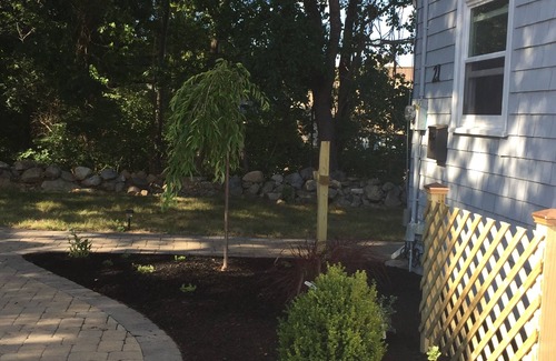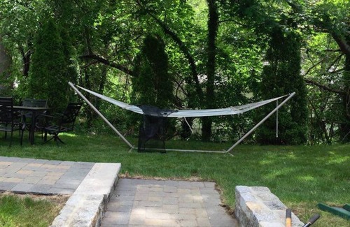 Om Suite Om is a comfortable, cozy and convenient studio efficiency space, with a separate key and entry, in the lower level of a house, situated a 6-8 minute walk down to the beach. It is very clean, nicely appointed with linens, and includes a bathroom/shower, double bed, TV, refrigerator, microwave, coffee maker, mugs and more. There is a recliner for relaxing inside, and a cafe table set for 2, for your morning coffee outside. The backyard is a serene and breezy spot, tucked right behind several places to walk to, such as ice cream, liquor store, supermarket, pharmacy, and of course, the beach! Great for a weekend getaway for two, wedding guests, and people who want to spend a week at the beach for a price that they can afford. There is designated parking in the large paverstone driveway and a hammock for your enjoyment. Please know it is a lower level, meaning there will likely be people walking above you, and the windows are new, but basement size (3 windows) and a screen on the door for fresh breezes and ample light.