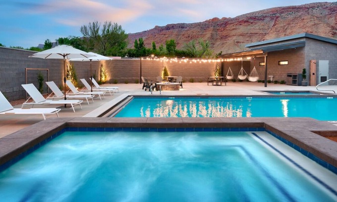 Best-rates for the Moab hotel starts from $180 per night with includes Parking, Wheelchair Accessible, Child Friendly, Air Conditioner, Pool, Accessibility, Security/Safety, Bedding/Linens, Wellness Facilities, Kitchen, Fireplace/Heating, Guest Services, TV, Hot Tub, Internet, Laundry StayAndPlay offers fully equipped golf villas, golf hotels, golf resorts, luxury golf cabins, and exclusive golf retreats, making it easier than ever to find your perfect golf escape — ideal for families, peaceful getaways, or pet-friendly retreats with the whole crew.
