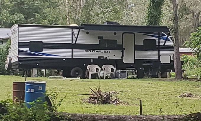 Enjoy a peaceful stay at this 2-bedroom recreational vehicle in Nobleton Fl. The cozy space sleeps 5 or we can set up a tent for the kids. Go fishing, kayak, canoe or just relax by the bonfire every night. Paved bike path through the forest or go mountain biking. Enjoy the magical nature of the forest or the river that are right in the front yard. Kayak/canoe adventures offered as well as horseback riding through the forest.