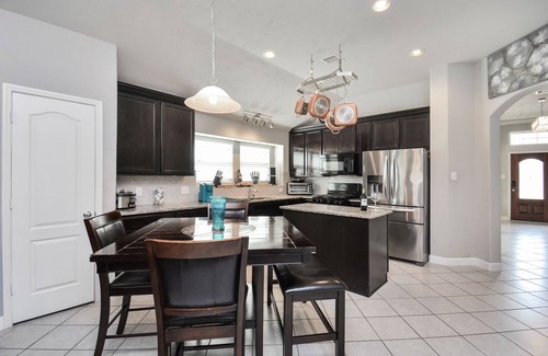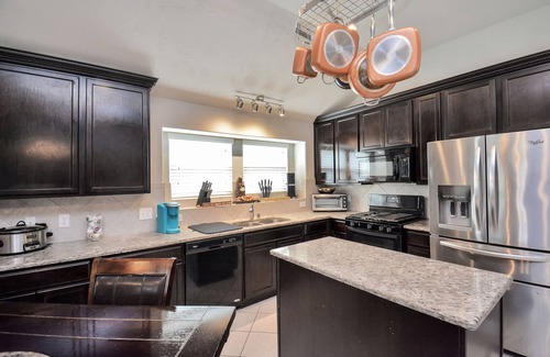 King bed, garden tub, huge back yard with grill and trampoline. Wine theme kitchen and large breakfast nook for family entertainment. TVs in every room with Netflix. WiFi is available. This home is located near south Houston/Pearland area.