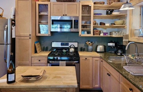 The recently-built home features a propane stove as its heating source, with a fully stocked kitchen, queen bedroom and full bath. There is a pleasant outdoor entry deck with two-person table and chair. The living area has an additional twin bed-sized dormer sitting area for additional sleeping, if need arises. Additional bedding is provided.