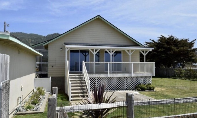 Take it easy at this unique and tranquil getaway. Nesika beach bluff house overlooks the ocean with spectacular views, you can see the light from the lighthouse in Port Orford. It is a short walk to the beach where you can walk for miles. Just six short miles north of gold beach with lots of hiking trails nearby. Well behaved and potty-trained dogs and cats allowed. Dog friendly with a fenced yard. There are 2 bedrooms each with a king size bed and 2 full bathrooms. There is a porch in back. A fire pit and a large private green yard.