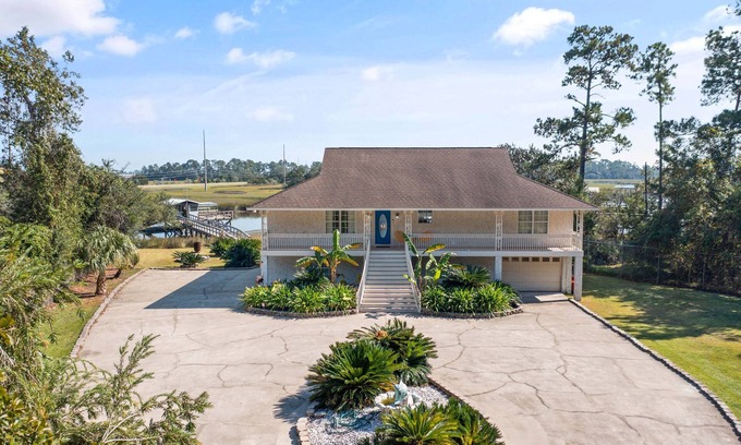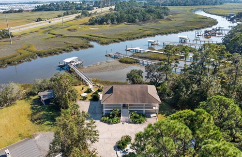 Beautiful 4-bedroom Coastal Tabby home on deep water with a dock. Enjoy boating and fishing just mins from Jekyll Island and St. Simons Island. Four spacious bedrooms sleep 9 comfortably. Large deck for outdoor dining and relaxing. Classic Coastal Bungalow design with all the modern conveniences including a game room. Master suite has a king bed. Gorgeous views of the water with available Kayaks. Deep water dock and boathouse with a fish clean table. Dog friendly with extra $95 fee. Please no cats the family is allergic.