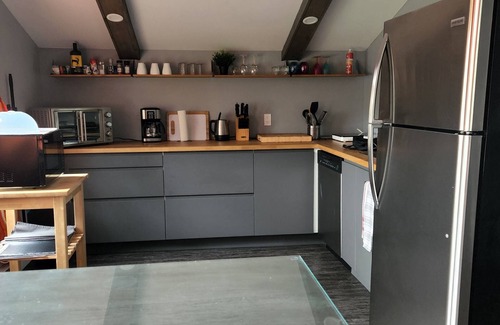 The loft easily accommodates 4-5 people. On request, a high chair and a playpen can be provided. The kitchen is equipped with two induction cooktops, a small cooking oven, a microwave, a dishwasher and a fridge to facilitate the preparation of meals. A BBQ is also available on the outside balcony during the summer period. A heat pump with air conditioning makes the loft comfortable all year round.