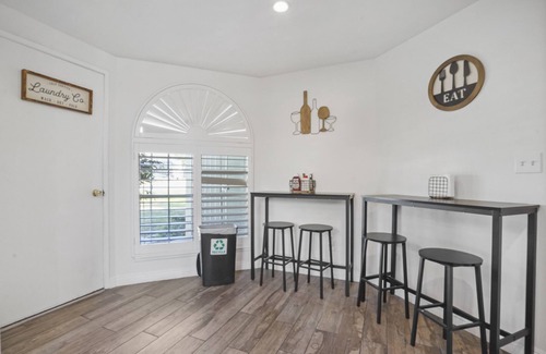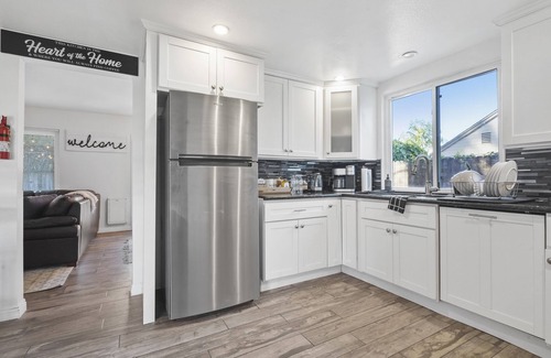 Come stay in the single story home with sleek wooden floors and a beautiful design. The light-filled living room with opens to the fully stocked kitchen with beautiful counter tops and a wooden dining table.