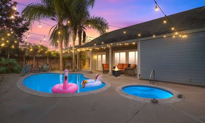 Welcome to your dream home—a place where every moment is crafted for joy. Imagine this: you're lounging in a backyard, surrounded by string lights, a fire pit & the sway of palm trees. Dive into a pool or unwind in the hot tub, all set within a stunning retreat that promises the ultimate escape. As the sun sets, fire up the BBQs, then head to the game room for some friendly competition with a smart TV & arcade games. This isn't just a vacation; it's a celebration of fun & unforgettable memories!