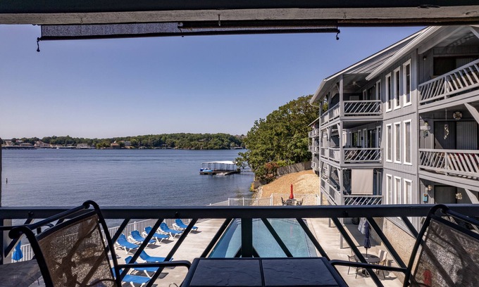 Walk-in level!! You will love the views from this family friendly two bedroom two bathroom condo in Osage Beach. It's the best of both worlds with a view of the inviting condo complex pool and the beautiful Lake of the Ozarks. You'll feel right at home as you enter to find a fully stocked kitchen with an island open to a cozy living area. The primary bedroom is appointed with a king bed and the second bedroom with a queen bed. The seasonal lakeside pool is close, just a short walk down a set of stairs. If you would rather swim in the lake, you can do that too from the private beach. Gather on the private lakeview balcony or in the comfortable living room where you will be able to see all of the lake activities. You'll be just minutes from area attractions such as shopping, restaurants, wineries, boat and PWC rentals. There is also a 12' X 32' boat slip available for an additional cost. You can always book with confidence through Four Seasons Property Management!