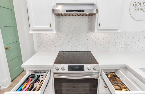 Savor sweet dreams in one of four bedrooms. The spacious ensuite primary bedroom and the second bedroom both feature plush king-size beds. You’ll love the beautifully tiled walk-in shower of the private primary bathroom. Perfect for couple who have small children, the third bedroom is outfitted with a king-size bed and a built-in bunk nook with twin-over-twin bunkbeds. The fourth bedroom was thoughtfully designed for kids and teens with two sets of twin-over-twin bunkbeds. All four bedrooms are furnished with flat screen TVs. Two additional full bathrooms give everyone space to get ready for the day’s adventures without having to wait in line. A dedicated laundry room houses a full-size washer and dryer. Toss everyone’s swimsuits in each evening to refresh them for the next day.