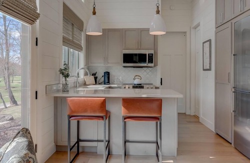 These cute, 500-square-foot Appalachian-style cottages, include an exterior of stacked stone, board and batten, and cedar shake roofing. Interiors, designed by New Blue Home, a Blue Ridge design firm, offers a cozy living room with ample space to relax and unwind, a full kitchen complete with sink, ample counter space and bar seating, wine fridge, ice maker, oven, microwave, Nespresso Vertuo Coffeemaker, and a washer/dryer to freshen up clothes after a hike or a day on the links. The cottages offers a separate bedroom with a king-size bed and a private bath with a tiled shower. Flat-screen smart TVs are located in both the bedroom and living room as well as window treatments for privacy. Delightful hardscaping surrounds the cottages, and a stone patio invites you to sit back and enjoy the fresh mountain air and sounds of nature. Two Adirondack chairs allow you to chill out and soak in the view overlooking the Award-Winning golf course and the Toccoa River. All guests are invited to The Tavern for a complimentary glass of wine, from 3:00 to 5:00, prior to a reserved dinner reservation.
