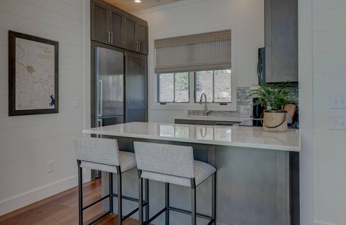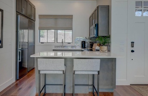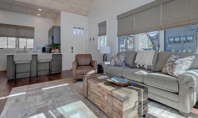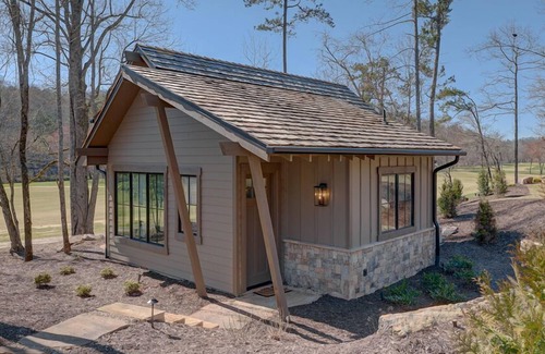 These cute, 500-square-foot Appalachian-style cottages, include an exterior of stacked stone, board and batten, and cedar shake roofing. Interiors, designed by New Blue Home, a Blue Ridge design firm, offers a cozy living room with ample space to relax and unwind, a full kitchen complete with sink, ample counter space and bar seating, wine fridge, ice maker, oven, microwave, Nespresso Vertuo Coffeemaker, and a washer/dryer to freshen up clothes after a hike or a day on the links. The cottages offers a separate bedroom with a king-size bed and a private bath with a tiled shower. Flat-screen smart TVs are located in both the bedroom and living room as well as window treatments for privacy. Delightful hardscaping surrounds the cottages, and a stone patio invites you to sit back and enjoy the fresh mountain air and sounds of nature. Two Adirondack chairs allow you to chill out and soak in the view overlooking the Award-Winning golf course and the Toccoa River. All guests are invited to The Tavern for a complimentary glass of wine, from 3:00 to 5:00, prior to a reserved dinner reservation.