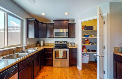 Inside, a welcoming living area features a smart TV (streaming available using your own account). The well-equipped kitchen is outfitted with a full suite of stainless steel appliances, and a large pantry provides plenty of room for vacation treats. Added perks include complimentary WiFi and a private stackable washer/dryer.