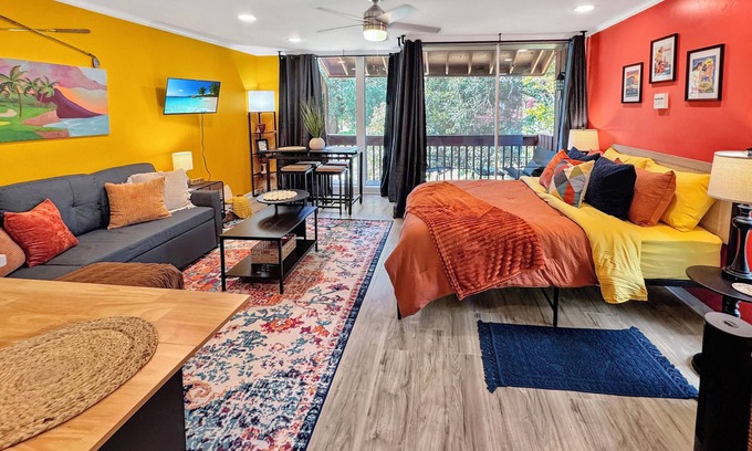 Inside, you’ll find a queen bed and a full-sized sleeper sofa, comfortably accommodating up to 4 guests. The condo is fully stocked- just bring your clothes and favorite foods! A full kitchen, in-unit washer and dryer, and all the essentials make your stay as easy as it is relaxing.