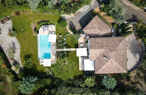 Luxury Villa 10 minutes from St Tropez Centre. A contemporary house built in 2007 of 250m2 and entirely renovated in 2022. Heated swimming pool. Located on the edge of Sinopolis just 5 minutes by scooter to St Tropez or 15 minutes by car. The house is on 3 levels. Garage and utility room on the ground level. Main living area with 2 bedrooms on the upper ground floor with terraces, eating areas and pool.The 1st floor has 3 bedrooms, one en suite and 2 bedrooms sharing a shower room. 5 bedrooms and 4 bath/shower rooms in total. Air conditioned throughout. Eating area outside. Garage for 1 big car. Parking for 3 cars. Furnished and equipped expensively. Wifi. Smart TV, Sonos, Green Egg BBQ. The garden is child friendly with a glass surround for the pool and is a 2000m2 area. The house has a green view and well located for access to all shopping. You can get to the famous St Tropez beaches via a reverse route avoiding St Tropez. There is also a remote available to use a traffic free short cut to St Tropez centre. There are 2 scooters available to use by prior agreement.