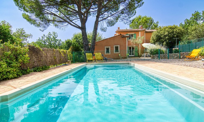 Beautiful single-family house "Gombaud", surrounded by meadows and fields. 7 km from the lake. Private: natural state property 2'500 m2, terraced garden with trees, swimming pool fenced (9 x 4 m, depth 120 cm, seasonal availability: 01.Jan. - 31.Dec.) with alarm system. Outdoor shower, boules, pergola (50 m2), terrace. Available: bicycles (2), children's bicycles (1). Stepped path (11 steps) to the house. Parking (for 3 cars) on the premises. Supermarket 5 km, restaurant 3 km, bus stop 3 km, railway station "Les Arcs Draguignan" 32 km, bathing lake "Sainte Croix" 41 km, lake de pêche Carcès 7 km. Golf course (18 hole) 23 km. Nearby attractions: Chute du Grand Baou 10 km, Grottes de Villecroze, La cascade de Sillans, Cotignac, Vallon Sourn. Well-known lakes can easily be reached: Carcès 7 km, Saint Croix 41 m.