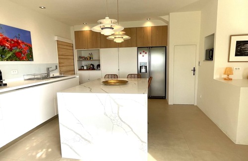 The air-conditioned house has beautiful reception volumes open to the outside. A magnificent 100 m2 terrace offers spectacular panoramic views over the Luberon. On the ground floor a room with bed 160 and shower room, separate wc, lounge and kitchen / dining room opening onto the terrace. Upstairs the master bedroom bed 160, a bathroom and shower, separate toilet. Two bedroom with 2 single beds. Separate shower room and toilet. All rooms overlook the panoramic view. Modern and elegant decor.