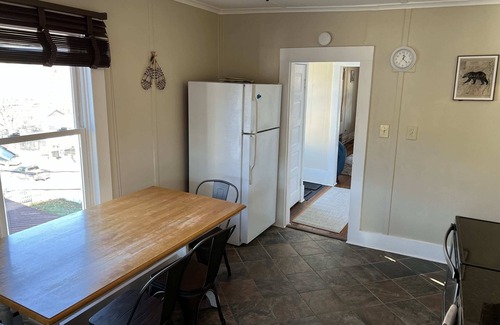 16 Wade St. 2nd floor of two story duplex. 3 Bedrooms; 1 Queen, 1 Full, 1 Twin with 1 twin trundle. Family Room with 2 couches, a leather recliner and 55" HD Smart TV with HULU Live provided . Small gally style, fully equipped kitchen and secondary eating area with full size kitchen table. Recently renovated, smaller sized bathroom with corner shower. Exterior porch with 2 sets of bistro tables with chairs overlooking downtown.