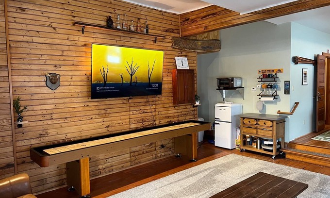 The "Club House" is a great space to entertain your party while staying in town. Whether you're a couple of buddies chasing powder, a family vacation that happens to catch a rainy day, or simply want a larger space to kick back for an Apre Ski hang out, we've got you covered! This unit boasts a pool / ping pong / dining table, dart board, 12' shuffle board table, record player, 75" 4k Smart HD TV and an arcade style game featuring several classic games. It also includes a refrigerator, microwave / convection oven, hot pot, coffee press and basic kitchen essentials for ordering take out or re-heating a snack. Featuring 1 bedroom and 1 bathroom, this space can sleep up to 4 people and up to 3 grown adults. The top twin bunk should only be used for children.