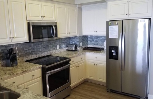 Amuse the senses with three large flat screen HDTVs with Wi-Fi Fire Stick viewing; enjoy full baths for each bedroom; King, Queen, Queen sleeper sofa, and Bunk Beds; Sleeps eight; fully appointed kitchen with top-of-the-line appliances and everything you need to prepare and serve a gourmet meal; granite counter tops; breakfast bar with stools for extra seating; laundry with washer/dryer in the unit; High Speed WI-FI.