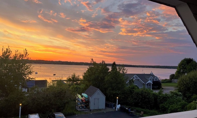 Gorgeous 2BR, 2BA, + Den waterfront apartment with balcony. Swim or kayak off of the building's dock. The space is near hiking trails, cliff walks, and secluded beaches. The apartment faces Harpswell Harbor to the west for stunning sunset views. This beautiful property features 2 bedrooms, including 1 queen bed and 1 full bed, perfect for a small group of guests. The apartment is furnished in mid-century style. The condo also offers amenities such as WiFi, an iron, fireplace, and a washer/dryer. The historic Cribstone bridge nearby takes you to Cook's Lobster House and other eateries. Approximately twenty minute drive to Brunswick's breweries, restaurants, and museums, Midcoast Hospital, and Bowdoin College.