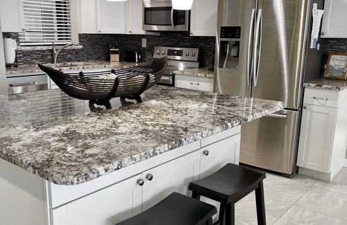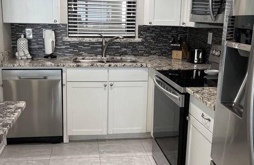 Kitchen is fully equipped with stainless steel appliances and granite countertops