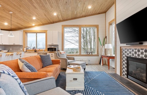 Our brand new Cabin Farmhouse is tucked behind a cherry orchard on a hill overlooking Elk Lake. Each floor has its own entrance with 3 bedrooms, full kitchens, and a washer-dryer. The entire house is done in shiplap and natural wood accents. A total of 6 bedrooms and 3.5 bathrooms is plenty enough room for groups of all sizes. The back of the house has a large deck for entertaining, and around the front has a large fire pit and seating. Pets are welcome with a fenced-in backyard!