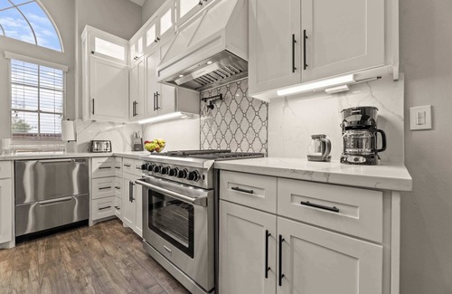 Our stocked kitchen is perfect for preparing meals with a large dining table, kitchen bar area and breakfast nook. Outdoor dining and BBQ as well!