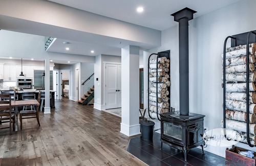 Open-concept dining room with a beautiful custom wooden dining table with seating for 10, amazing views and a walkout to the deck. A wood-burning stove separates the kitchen/dining room from the living room.