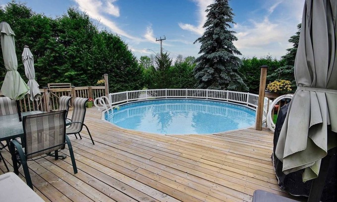 The Winfield Chalet is a gorgeous homey cottage just steps away from the Georgian Bay. Immerse yourself in our flagship Winfield Library - a wall shelf of 1000+ books next to our natural gas fireplace, all enclosed in an elegant massive wood cathedral ceiling. Luxuriate in our unique amenities: A heated garage (perfect in the winter!) with air hockey, ping pong, darts, plus a deck with a heated 22' above-ground pool, a backyard with 15’ trampoline, 6 station swing set, and a hammock by the outdoor firepit.