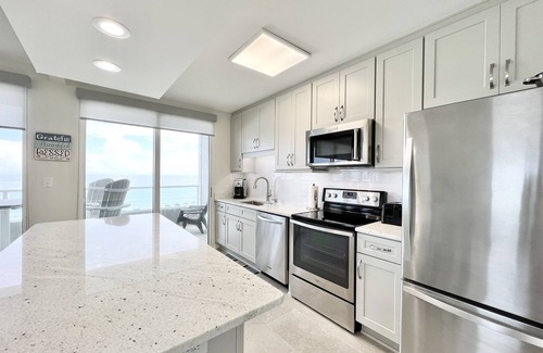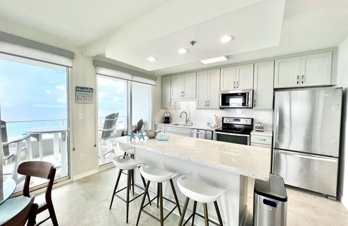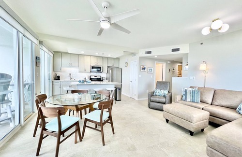Our condo is a 3 Bedroom, 2 Bath condo, accommodating only up to 8 persons (Maximum 7 Adults; including up to 4 children with list of names and ages of all guests to be provided). Primary King Bedroom with Ensuite Quartz Counter Shower Bath, Secondary King Bedroom and Third Bedroom with Queen & XL Full Bunk Bed. Hall Full Tub/Shower Combo Quartz Counter Bath. Stainless Appliance Kitchen, White Granite counters and Island Breakfast Bar with seating for 4 people. Open Living Plan overlooking the balcony and beach includes Leather recliner, sectional couch, TV and Glass Dining Table seating for 5 people.