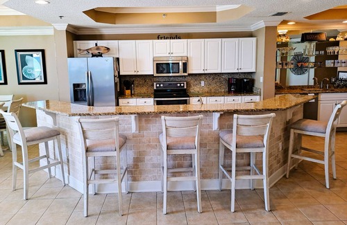The spacious bar has granite counter tops and is stocked with all glassware and accessories needed to make your favorite beverage. The separate ice maker at the bar will provide all the ice necessary for your daily outings.