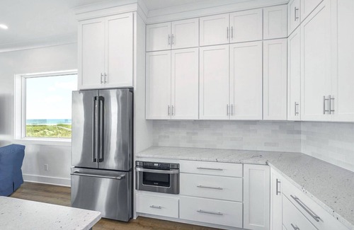 Step into the heart of this stunning upscale gulf front home, where a culinary oasis awaits your family's delight. The chef's dream kitchen embodies elegance and sophistication, making it the perfect hub for memorable gatherings. The sprawling, polished granite island provides abundant space for meal preparation and quality time with loved ones. Embracing modernity and efficiency, the kitchen boasts all stainless-steel appliances, including a top-of-the-line gas stove that invites you to explore your culinary talents. Cleanup becomes a breeze with the deep farmhouse kitchen sink, allowing more time to savor the magic of cooking together. For a front-row seat to the culinary action, four bar seats are ready to accommodate your family while you witness masterpieces in the making and engage in delightful conversations.