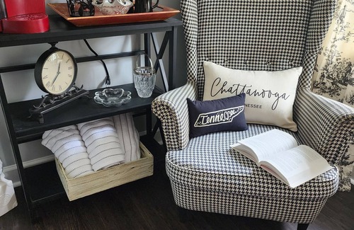 The second bedroom boasts a Chattanooga-themed decor with a comfortable queen-size bed and a cozy reading corner, while the third bedroom offers another queen-size bed, a vanity/dressing table, and generous storage space. All bedrooms are bathed in natural light from two windows in each room, creating an inviting atmosphere.