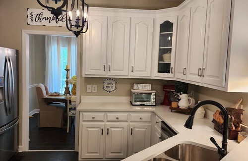 A well-appointed kitchen with quartz countertops and stainless steel appliances, including a gas stove, Breville, and Kitchenaid appliances, ensures culinary enthusiasts have everything needed to cook and entertain. The adjacent formal dining room, with seating for eight, overlooks the charming front porch, while the formal living room provides a cozy retreat for reading, music, or cocktails, complete with a small bar. There is a well-organized laundry room with brand new Samsung Front Loader Washer and Dryer. The family room which is part of an open area plan to the kitchen has a large sectional sofa, a 60" flat screened television and overlooks the back screened in porch. There is extra seating (two chairs and two foot stools that can be pulled into this area). The fireplace is gas and is great for chilly days and evenings. Lots of candlelight all on timers for a really cozy space. Lovely to come home to. There is a ceiling fan/chandelier in this area on remote. There is a lovely half bath that is located in this area, chinoiserie style.